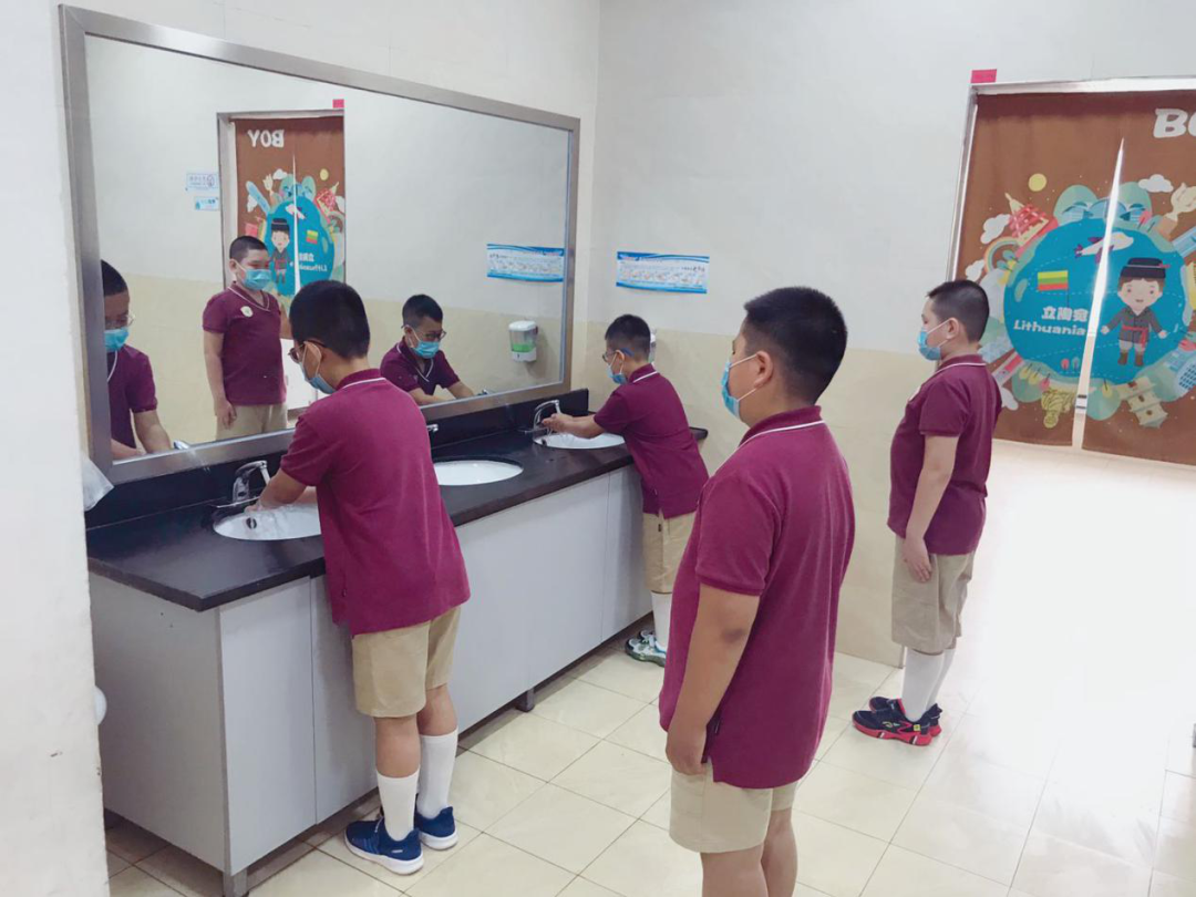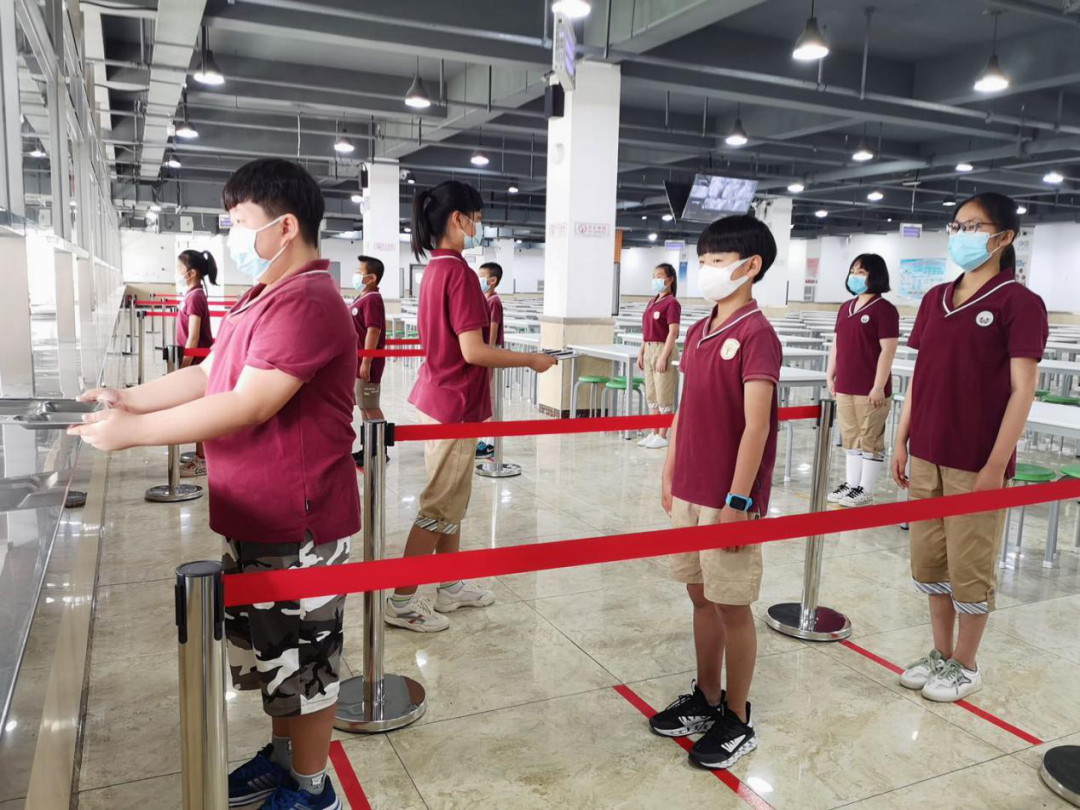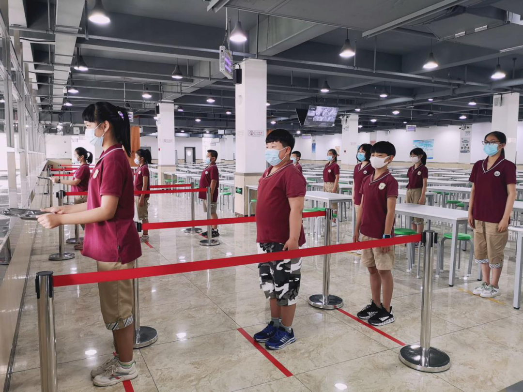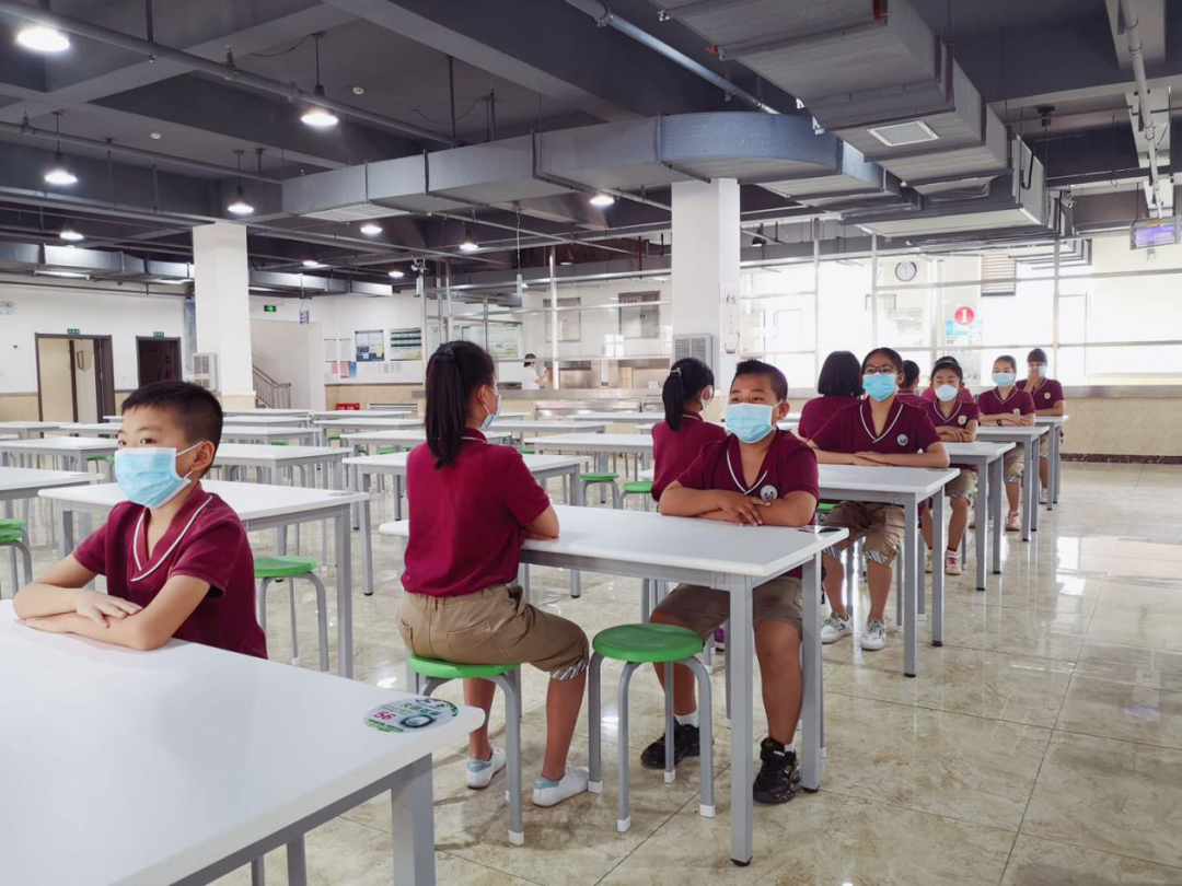 用餐前,同学们用七步洗手法清洗双手;盛饭时,保持间距,有序排队;用餐时不交谈,加快用餐速度;用餐后,用消毒湿纸巾擦拭桌面,保护自己也保护他人。