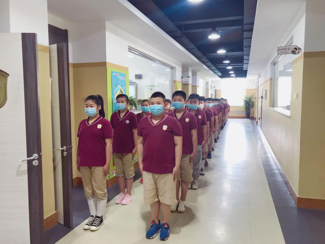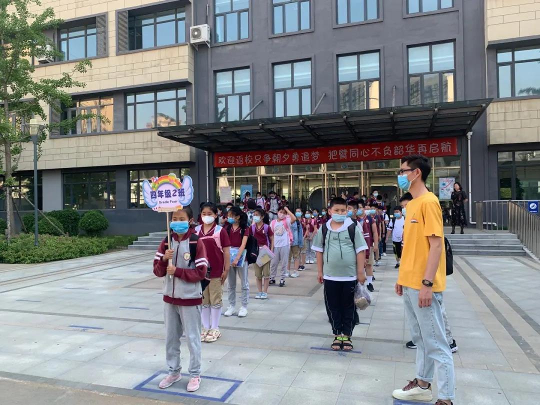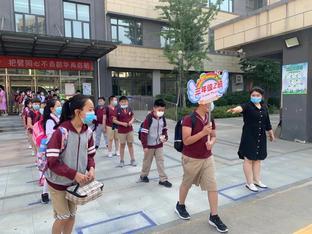 放学时间到了,同学们有序地列队,保持间距,在老师的守护中平安离校。