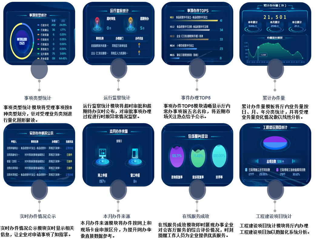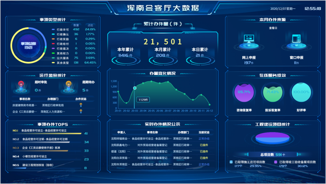 此次推出“浑南会客厅”大数据平台,是在“领跑加速度”的基础上充分整合现有数据,利用大数据云端处理并实时反映到群众眼前。大数据平台放置于北咨询台电梯口处,打破传统表格统计表现方式,以线形图、饼状图等多种图形化模式更新会客厅实时数据。平台共分为事项类型统计、运行监察统计、事项办件TOP5、累计办件量、实时办件情况公示、本月办件来源、在线服务成效、工程建设项目统计八大模块。模块间相辅相成,实时监控浑南区所有行政审批事项。
