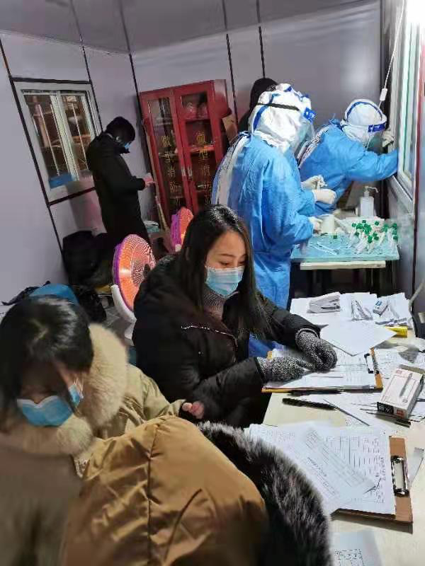 2020年12月31日下午,全体审计干部集结到位,维持现场秩序、引导排队侯检、登记居民信息、入户通知……忙碌到深夜,上岗后的第一顿饭是晚上11点。1月1日起,审计干部兵分3组赶赴不同驻点,他们不畏严寒保证检测效率。有的社区年代久远,多为老旧楼院,很多单元楼栋没有电梯,小区没有物业,挨家挨户通知全靠两条腿,审计干部克服身体极限,确保不漏一户不差一人。