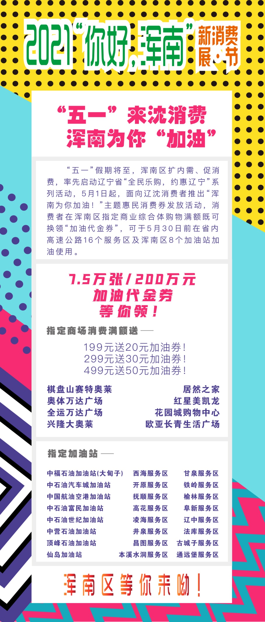 “五一”假期将至,为进一步扩大内需、提振消费,浑南区火热启动辽宁省“全民乐购,约惠辽宁”系列活动,5月1日起,面向辽沈消费者推出“浑南为你加油!”主题惠民消费券发放活动,消费者在浑南区指定商业综合体购物满额既可换领“加油代金券”,可在省内高速公路16个主要服务区及浑南区8个加油站加油时使用。