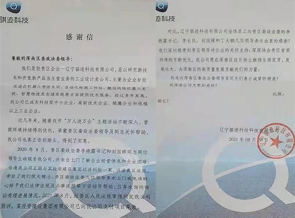 结合政法工作实际,以进企业、进单位、进社区等形式,坚持开门纳谏,征集意见建议,梳理解决问题。用心用情解决企业、群众急难愁盼问题,努力为群众排忧解难,及时回应群众关切。在开展万人万企活动中,浑南区委政法委领导在走访驻区企业——辽宁骐迹科技有限公司,了解该企业因与某投资建设集团存在经济纠纷问题,牵扯了企业很大精力,也影响了企业正常经营。为帮助该企业解决面临的实际困难,区委政法委综治科长刘国辉同志多次上门给予法律法规及办事流程上的指导,耐心询问诉讼受理情况,最终法院判决该企业胜诉,追回了工程拖欠尾款。2021年8月20日,公司负责人专程送来感谢信,表达诚挚的谢意。政法队伍教育整顿以来,区委政法委先后到辽宁省云南商会、沈阳国际软件园、浑南区平安志愿者协会、浑南六中、北师大附小及河畔社区等企业单位,广泛开展爱民实践活动,现场协调解决具体问题,解决了小区停车难、校园周边交通安全隐患、化解信访积案等具体问题共15件。