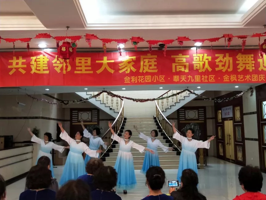 奉天九里社区联合金利花园小区举办迎十一文艺汇演,为祖国母亲庆生,与社区居民同乐。金枫艺术团带来的大合唱《亲吻祖国》,悠扬的歌声将居民们深深吸引,扇子舞《和谐中国》让现场居民如痴如醉,模特走秀、魔术表演、群口快板和诗朗诵等节目更是引发观众雷鸣般的掌声,演员平均年龄达75岁的小合唱《唱支山歌给党听》,将现场气氛推向高潮,整场演出在乐队激昂奋进的乐曲声中结束。
