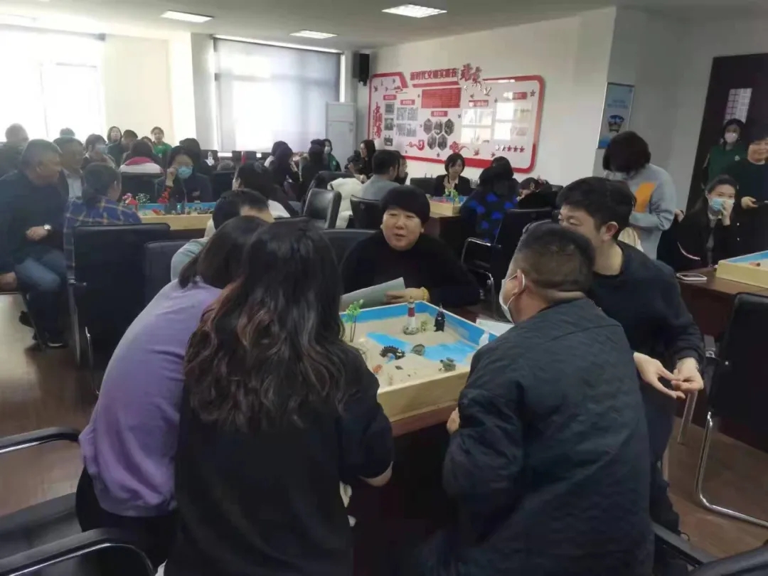 在活动现场,30余名干部职工分成6组,通过沙盘游戏体验别样的沟通与连接,《国泰民安》、《回家之路》、《面朝大海,春暖花开》、《浪漫之城》、《蓝天岛》、《其乐融融》等主题沙盘道具呈现在大家眼前,代表着大家在日常工作中没有表露过的关于生命历程与幸福生活的理解。8位专家老师带领街道、社区干部找寻沙具,搭建专属于站东人的“沙盘世界”,分享个人内心真实的想法。通过活动,大家的情绪得到舒缓和释放,沙盘游戏将心理健康教育与知识性、趣味性、参与性、操作性集于一体,进一步打开同志们内心世界的“大门”。