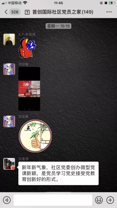 首创国际社区在党史学习、党课开展、党员教育工作中不断创新形式,通过建立“党员之家”微信群对社区广大党员进行系统化管理,号召党员通过《人民日报》、《半月谈》、《学习强国》等途径坚持学习。针对社区退休党员,各党支部书记与退休党员保持沟通,鼓励退休党员积极参加各类党员活动。“人退休了,思想不能退休,只有坚持参加社区的党员活动,坚持学习,才能保持先进的思想,时刻准备好为国家和人民做贡献。”退休党员李阿姨说。