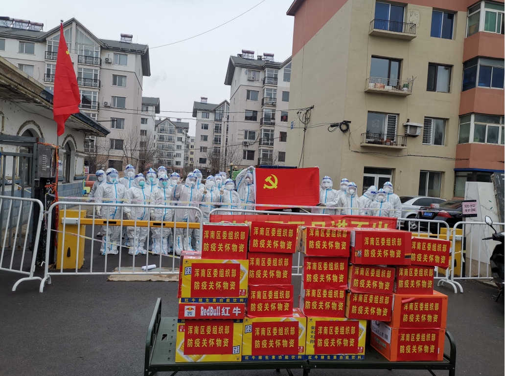 为贯彻落实市疫情防控指挥部工作要求,响应市委组织部号召,实现疫情有效防控,做好封控区域内党员、干部的关心关爱工作,3月18日上午,浑南区委组织部深入东湖、白塔、桃仙、李相、高坎等五个街道域内封控小区,为封控小区内成立的临时党支部配发党旗,并为参与疫情封控一线的1290余名机关抽调干部送去方便面、火腿肠、八宝粥等生活物资,传递党组织关怀和温暖。