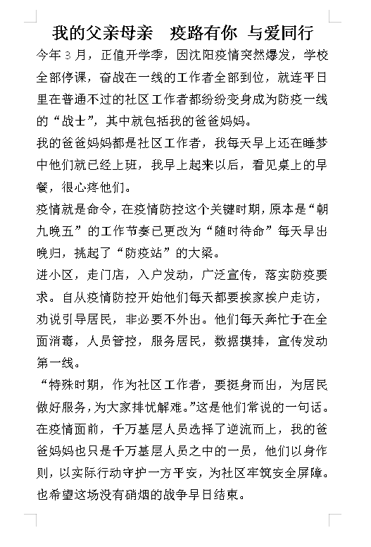 一天,正在整理报备人员档案的张健收到一条微信,眼神立刻从疲惫转为温馨。这条微信是女儿张欣越发来的一个表情和一张截图,截图上是一篇作文——“我的父亲母亲 疫路有你 与爱同行”。“我的爸爸、妈妈都是社区工作者,我每天早上还在睡梦中他们就已经上班,我早上爬起来以后,看见桌上的早餐,很心疼他们......”。文章不长,可就是这短短的一篇文章,让张健一扫疲惫。突然间,他觉得女儿长大了,懂事了,他觉得无比自豪,正是因为自己与爱人的默默付出,为女儿树立了榜样。