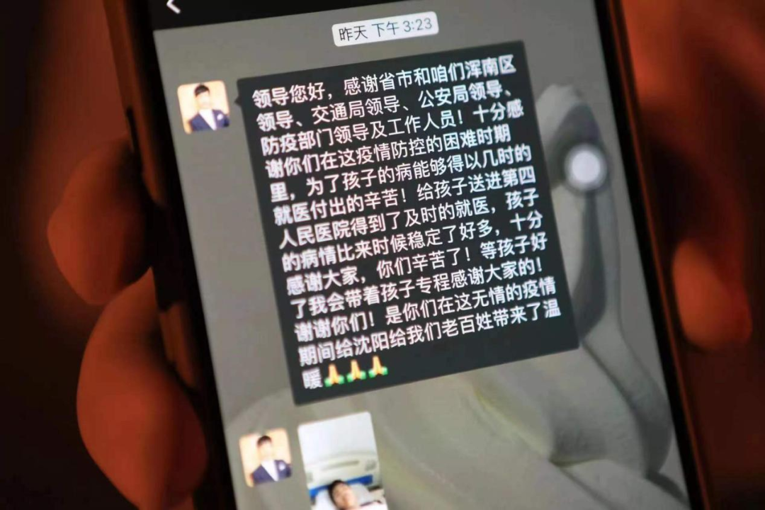 还有一次,吉林桦甸的一家三口几天前来沈阳给孩子看病,当时孩子全身水肿,情况危急,区交通局工作人员姚志伟将情况上报浑南区公路疫情防控指挥专班领导,经过上级部门的积极协调,孩子终于通过特别通道得到救治,在了解到这个家庭经济困难的情况后,浑南区公路疫情防控指挥专班领导梅永春还帮父母二人申请减免了隔离费用。孩子父亲在微信中特别感谢了各级领导和工作人员,同时深切的体会到沈阳的温度。