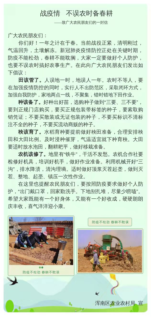 当前正值春耕生产的重要时节,浑南区在抓好疫情防控的同时力保农业生产,编写了《战疫情,不误农时备春耕--致广大农民朋友的一封信》,对翻田积极引导群众在做好个人防护的情况下,提早开展春耕工作。