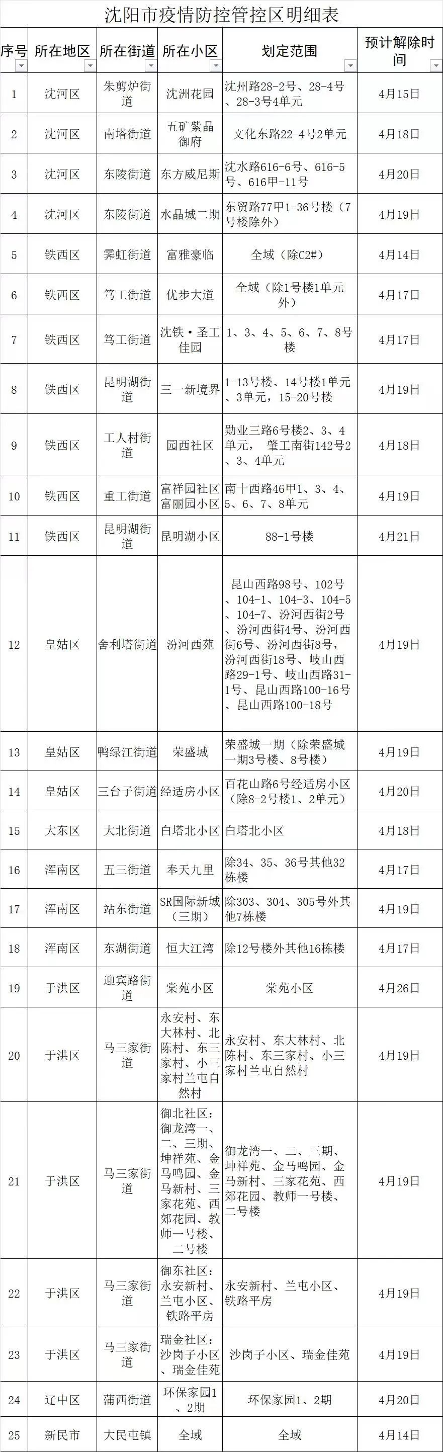 (一)《沈阳市疫情防控封控区明细表》《沈阳市疫情防控管控区明细表》(详见附件)所列区域的封控区、管控区继续严格执行疫情防控相关措施。苏家屯区管控措施由区疫情防控指挥部根据疫情形势另行公告。