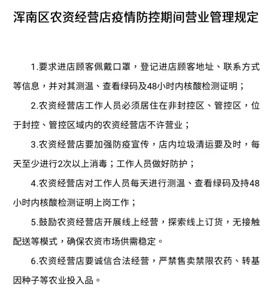 下一步,浑南区将加强对相关人员卫生知识的培训,督促和指导农资经营业主深化落实疫情防控各项措施,健全查验健康码、行程码和核酸检测阴性报告制度,每日对办公区域、营业场所以及门窗把手、桌椅台面等物体表面进行日常消毒消杀,保持环境卫生清洁,最大限度保障群众身体健康,更好为全区恢复生产生活秩序提供安全保障。