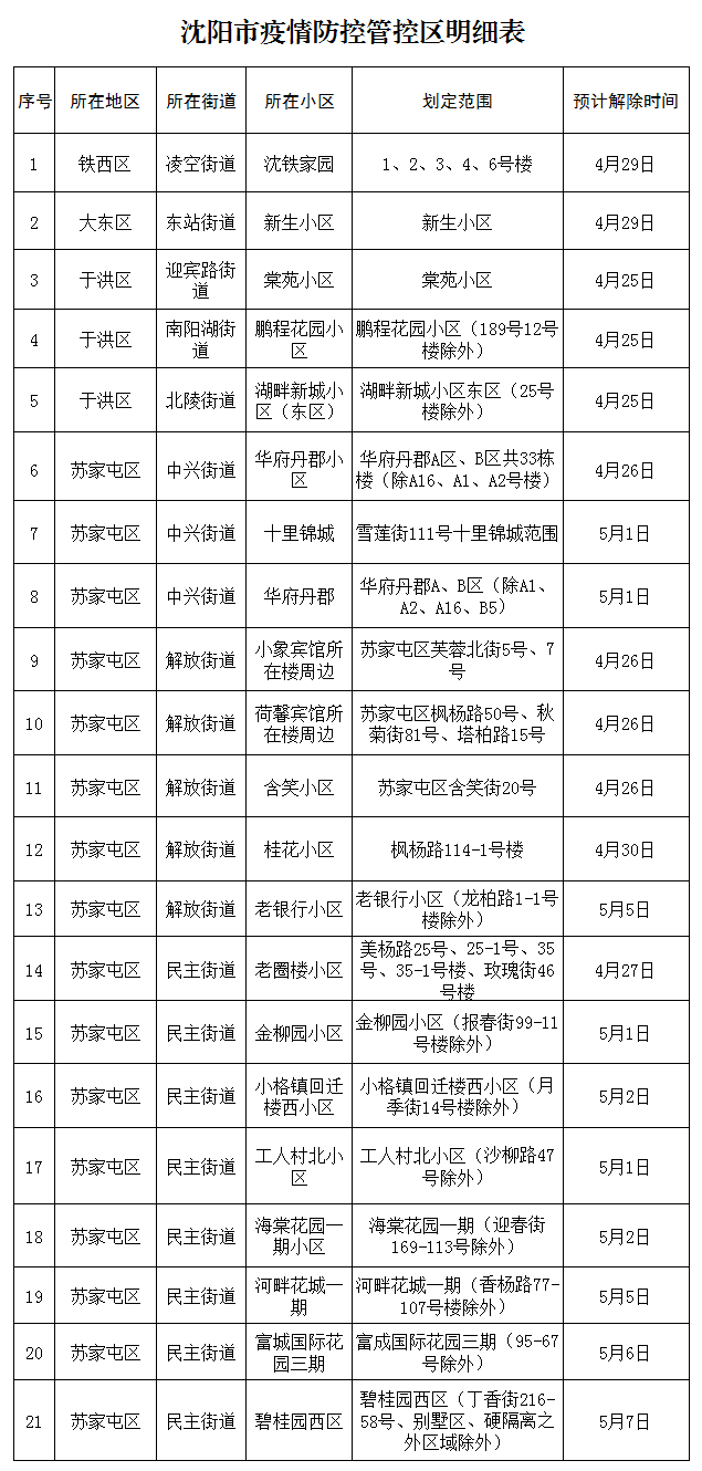《沈阳市疫情防控封控区明细表》《沈阳市疫情防控管控区明细表》(详见附件)所列区域的封控区、管控区继续严格执行疫情防控相关措施。苏家屯区管控措施由区疫情防控指挥部根据疫情形势另行公告。