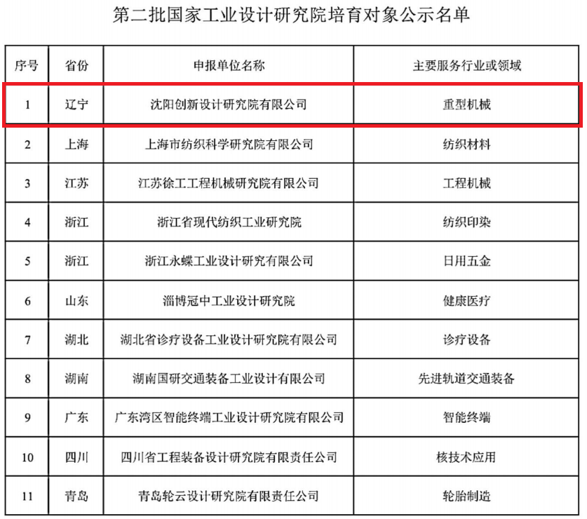 近日,工信部遴选的第二批国家工业设计研究院培育对象完成公示,全国共有11家单位名列其中。作为东北地区的唯一代表,我区企业沈阳创新设计研究院有限公司以“重型机械”为主要服务行业领域入选名单。