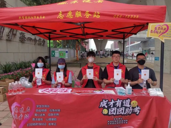 为助力中考,营造良好的考试环境,浑南区文明办、团区委联合开展了“成才有道 团团助考”中考助考服务活动。分别在浑南区第四中学、浑南区实验中学、浑南区实验小学设置了“助力中考志愿服务站”,每个服务站都有5名青年志愿者,为参加中考的考生及家长免费提供矿泉水、一次性口罩、爱心文具包、纸巾、雨衣等爱心用品,并为考生及家长开展普法宣传活动。青年志愿者以贴心的服务方式,让考生和家长感受到温暖和真情。