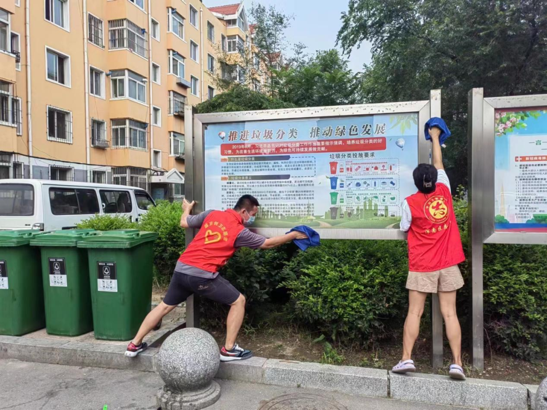 在桃仙街道绿色家园社区,志愿者们手拿抹布、水桶、夹子等工具,认真擦拭宣传栏,清洁小招贴,清理街头垃圾,全面清理小区,美化居住环境。同时,社区志愿者们还向小区居民进行环境卫生宣传,增强居民的环保意识。