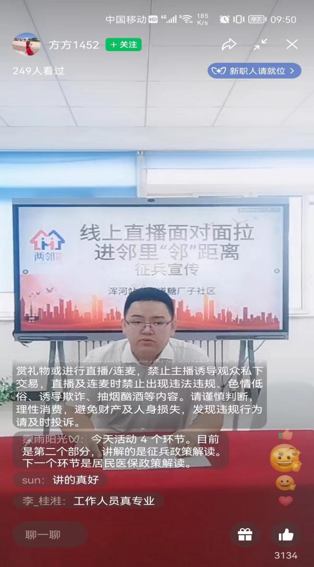 直播过程中,社区邀请“几美”教育学校校长,针对中、高考特长生招生政策进行现场解答。让家长及学生更加明确自己的目标,为下一步学习提供了指导方向。“居民医保”关系到每个人的看病问题,跟每位居民息息相关,社区工作人员对沈阳市城乡居民基本医疗保险政策进行讲解。社区专职负责人对2022年“征兵”政策及具体要求进行详细阐述,浑河站东街道工作人员对大学生入伍学费补偿和贷款代偿政策、退役士兵复学复读和就业扶持政策、选取士官、士兵提干和考学政策进行系统解答,并鼓励大学毕业生参军入伍,激励有志青年,加入建设世界一流军队行列,让青春和激情在热火军营中尽情挥洒。