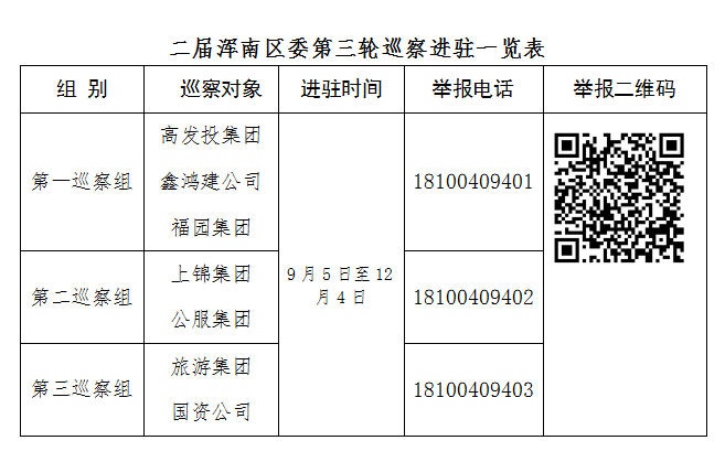 会议明确,二届浑南区委第三轮巡察对象为沈阳上锦城市建设集团有限公司、沈阳现代城市公共服务集团有限公司、沈阳福园实业集团有限公司、沈阳高新发展投资控股(集团)有限公司、沈阳旅游集团、沈阳鑫鸿建实业有限公司、沈阳市浑南区国有资产经营有限责任公司等7家单位党组织。区委3个巡察组9月5日开始进驻被巡察单位党组织开展工作,巡察时限3个月左右。本轮巡察监督重点为“三个聚焦”,结合区情实际,针对国有企业行业特点,有效开展政治监督。