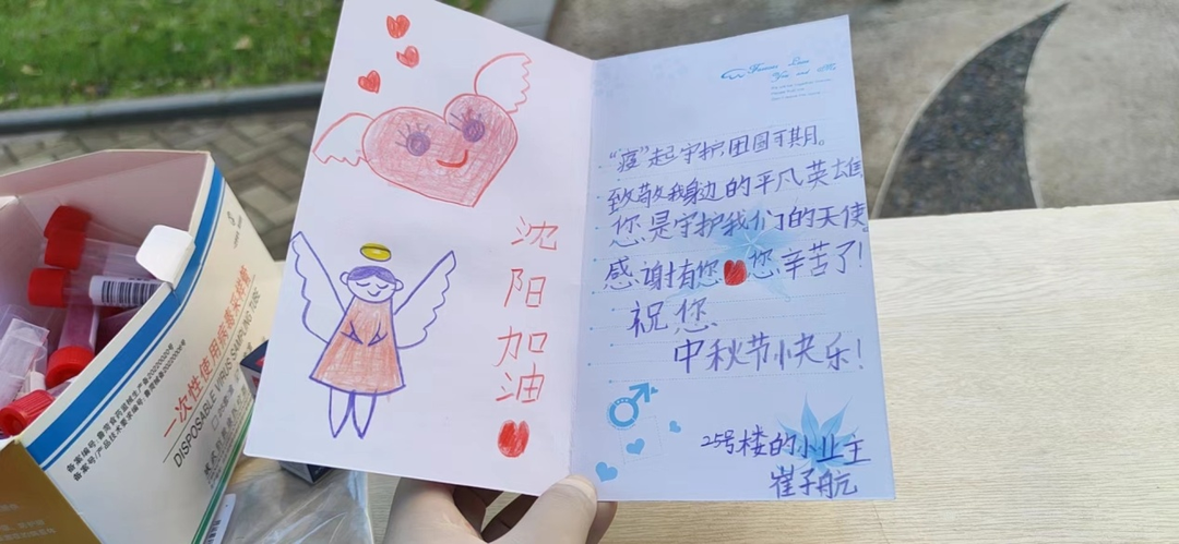 持续多日的高强度工作也让大家略显疲惫,9月7日早上,一份特殊的礼物让工作人员们倍感温暖和安慰,榆工社区金地檀郡、佰代宜居核酸检测点的工作人员同时收到了小区居民亲手书写的祝福卡和月饼。纸短情长,这份深深地情谊是对社区工作的认可与肯定,也更加坚定了榆工社区全体工作人员为民服务的初心。最初面对严格执行的出入小区程序,也有居民不理解,抱怨多过配合。然而十多天来,为了能让核酸检测六点准时开始,社区工作人员们每天5点半准时到达点位,布置场地、对接医护、通知居民、扫码发卡。核酸检测之后,还要继续管控重点人员、走访商户、核实数据、入户排查,努力看好小区的大门。这些居民都看在眼里,他们也从最初的不理解、不配合,到现在的成为志愿者,齐心协力,与社区工作人员们一起守护自己的家园,用最平凡的力量,筑牢疫情防控的坚实堡垒。