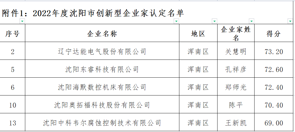 市工信局日前对2022年沈阳市创新型企业家认定名单进行公示,其中我区辽宁达能电气股份有限公司总裁关慧明等5位企业家拟被认定为创新型企业家,数量全市第一,占全市的29%。