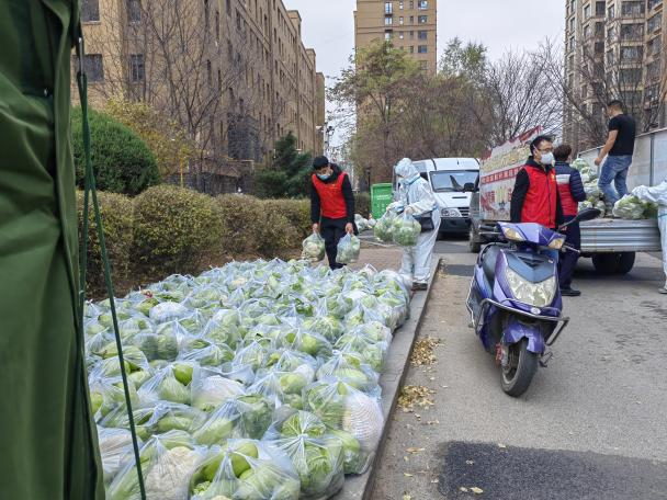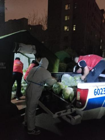 为保障封控区居民日常生活所需,迅速协调第一批爱心蔬菜包抵达封控区。面对第二天即将来临的雨雪天气,为防止蔬菜因储存问题受到损坏,抗疫专班果断决定要与恶劣天气争时间,在降雪来临之前派发完蔬菜包,保证居民第一时间拿到新鲜的蔬菜。支援干部和志愿者冒着小雨,顶着寒风,不辞辛苦的搬运物资,连夜将食材挨家挨户地送到772户居民手中,让居民有菜吃,吃好菜,竭尽全力保障居民日常饮食供应。