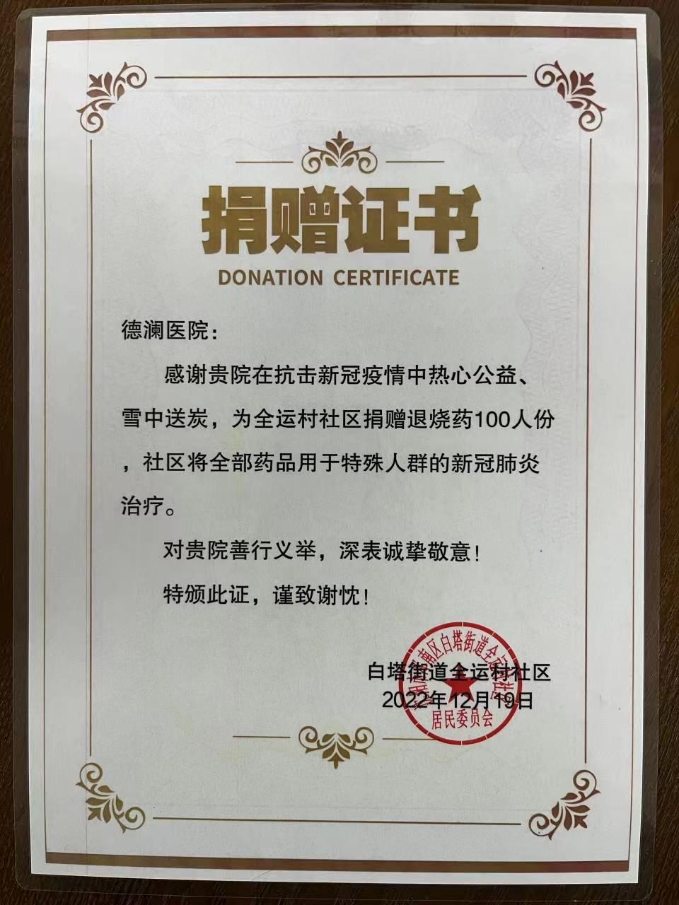 全运村社区党委德澜医疗集团非公支部旗下的德澜医院热心公益、雪中送炭,日前为社区捐赠了100盒对乙酰氨基酚(扑热息痛),社区在第一时间将全部药品用于重点脆弱人群的新冠肺炎治疗。