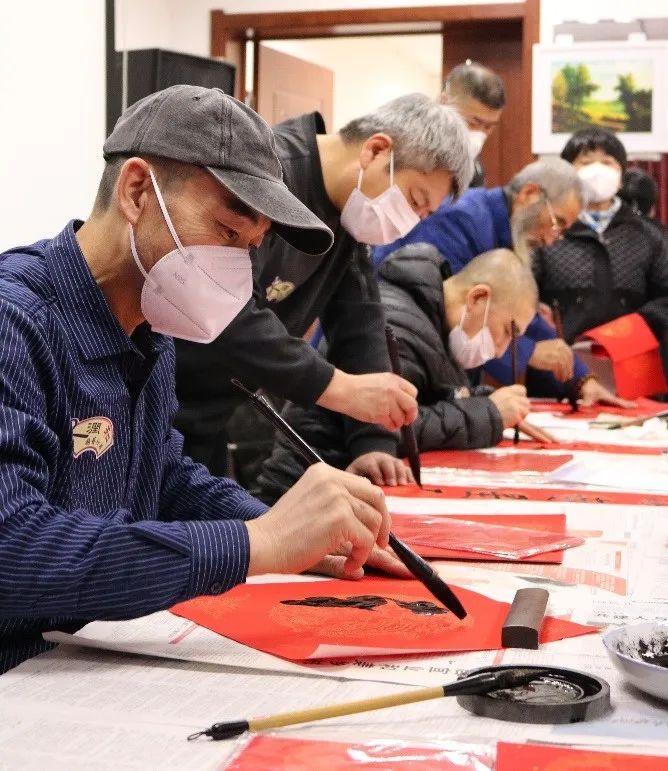 在活动现场,润泽国艺社的老师及学员们早早准备好各类书法用具,使用行书、草书、楷书等笔法挥毫泼墨。大红的春联喜气洋洋,真诚的祝福溢于字里行间,浓浓的年味浓缩于一笔一画之间,将新年祝福倾注于喜庆的春联纸上,传递邻里情,寄托着人们对新春的憧憬和向往。社区工作人员为大家摆放春联等待墨干,再把这些春联送给广大社区居民。