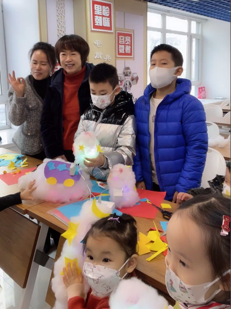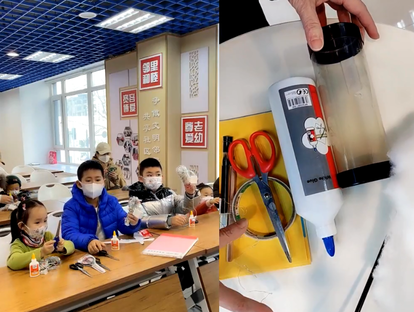 活动中,社区的大朋友、小朋友们都在屏幕前被这堂有趣的美工课深深吸引,在教师的讲解和引导下,大家纷纷动起手来。彩灯、棉花、矿泉水瓶……这些生活中随处可见的普通材料,通过小朋友和家长们一步步的搭建、固定、裁剪、粘贴,变成一个个彩色、漂亮的云朵小花灯,小朋友和家长的脸上都洋溢着幸福的笑容。