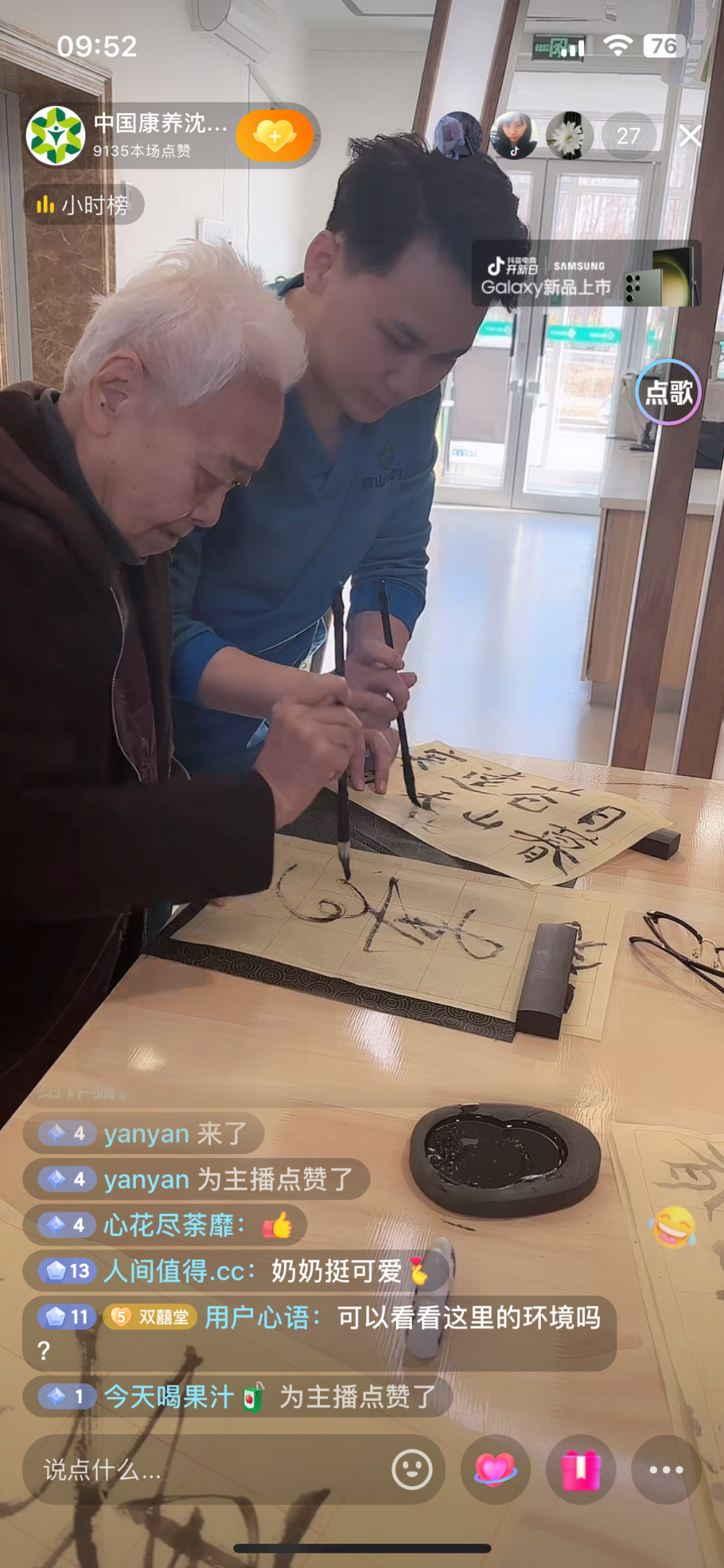 打开手机进入直播间,浑河站东街道彩霞社区负责人正在现场与直播间里的观众互动,详细介绍居家养老政策,包括服务对象、办理要件和办理流程。楠山有约照护师小朱通过摄像头带领居民云参观养老院,并现场回答观众对于养老机构感兴趣的话题,如环境、安全、价位和照护流程等,实时展示老人们真实的养老生活。镜头一转,画面中出现93岁高龄的李奶奶,是位离休老干部,正现场展示自己的书法才艺。她表示非常喜欢这里,“养老院就像自己的家,工作人员就是自己的子女!”