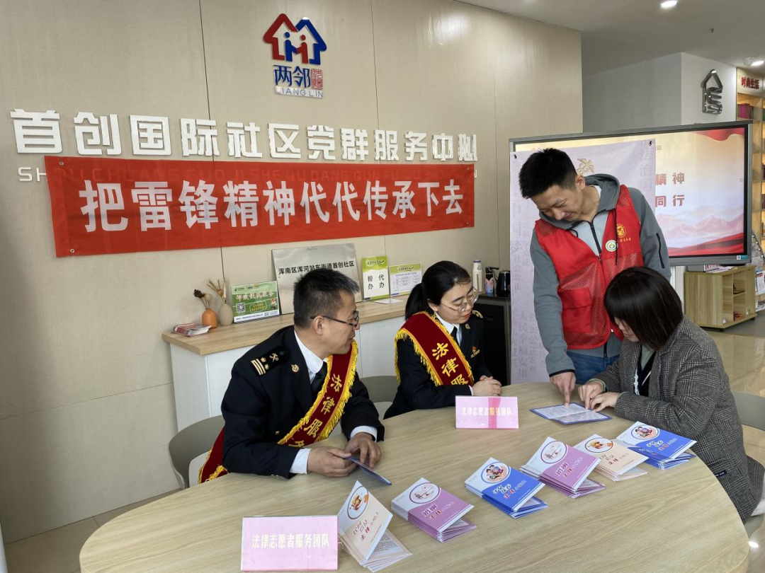 浑河站东街道首创国际社区党委联合沈阳海关办公室党支部、沈阳海关法规处党支部开展了“学雷锋”公益普法活动,为社区居民、退役军人提供专业法律咨询服务并现场解答居民们日常生活中遇到的婚姻财产、邻里纠纷、劳务纠纷等法律问题,并结合实际案例进行普法宣传。