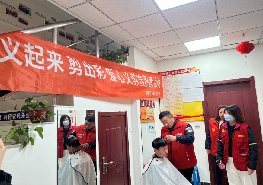 在东湖街道温馨港湾社区,新时代文明实践站组织志愿者开展了“情暖夕阳 春风义剪”—学雷锋志愿服务活动,为居民义务理发。