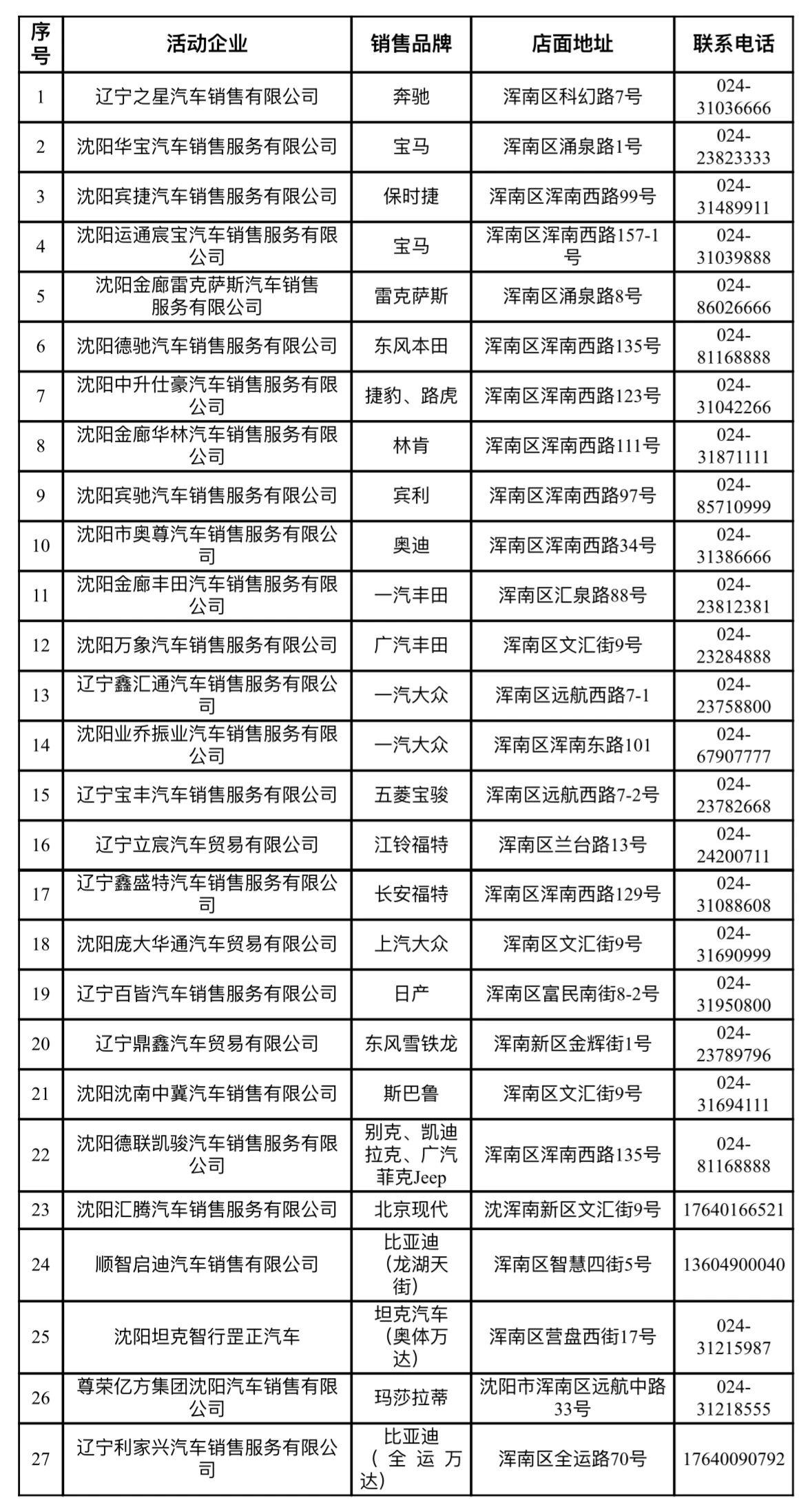 浑南区27家参展的汽车零售企业(见附表)在售的家用7座(含)以下非营运新车。