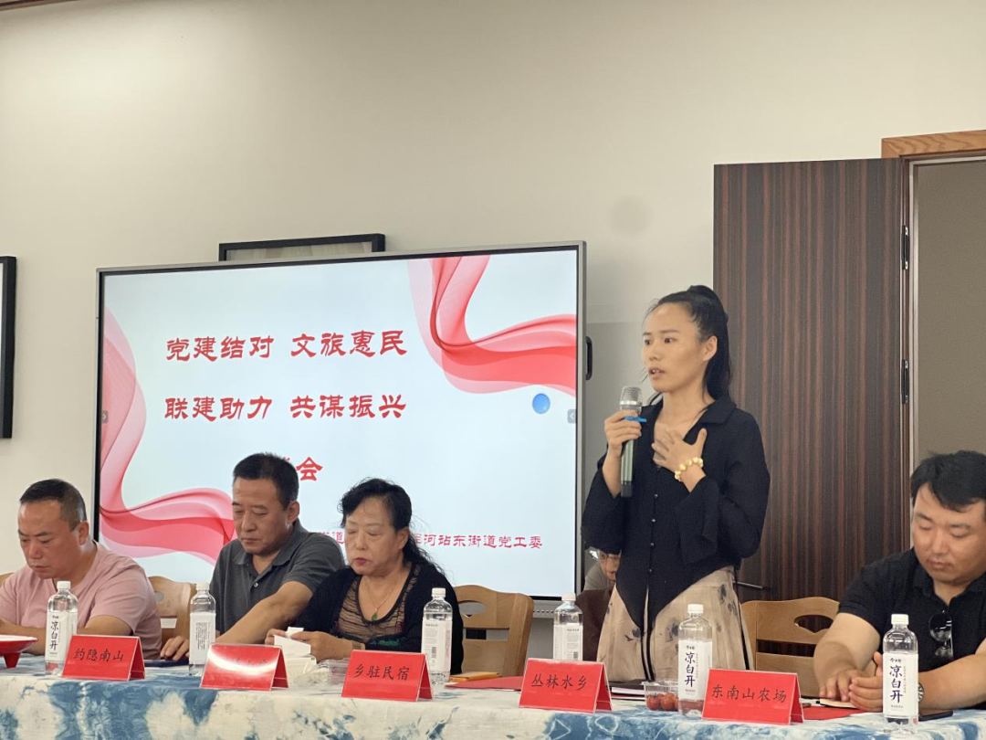 在随后的交流互动环节,各文旅企业代表和社区书记代表畅所欲言,各抒己见。幸福豆亲子农场对经营项目开展情况进行生动讲解和热情推介;沙地沟农场对精心培育、深受欢迎的无土栽培西红柿进行了现场展示;马语营地主题餐厅提出推进旅游服务品牌化运作;锦绣山庄和丛林水乡则提出希望实现客流资源共享,经验互学互鉴,增加消费黏性。其他企业代表也纷纷发表意见,交流讨论,气氛热烈融洽。