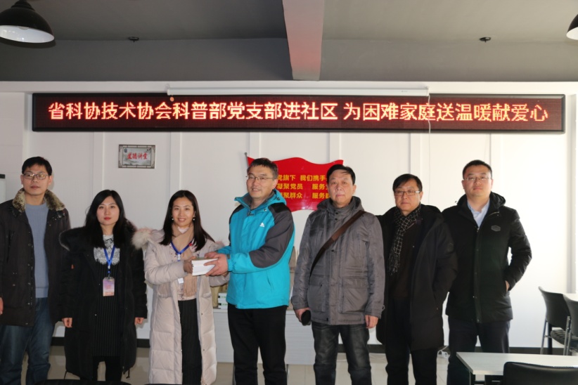 2月2日下午,省科协党组书记、副主席张春英,副主席王元立、崔铁民、朱玉宏带领20余名机关在职党员分别到桃源科普大学分校、绿色家园科普大学分校开展“在职党员进社区送温暖”活动。此次活动共分为两项内容:一是志愿服务活动,为社区科普大学赠送科普图书;二是实现微心愿活动,根据社区征求的微心愿,为社区低保户等弱势群体送去牛奶、鸡蛋、挂面等节日慰问品,其中桃源社区走访慰问4户家庭、绿色家园社区慰问2户家庭。用实际行动体现党员先锋模范作用。通过此次活动,充分发挥了在职党员的先锋模范作用,拉近了社区、在职党员与辖区居民之间的距离,融洽了党群关系,在临近春节之际,为社区居民送去温暖,促进了社区的和谐发展,同时也为今年科普大学工作的开展奠定了良好的群众基础。