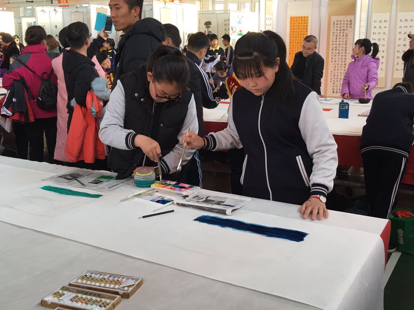 会议结束后,赵树栋、董浩及书画名家和学生们参与了百米长卷书画活动,现场挥毫泼墨,交流艺术心得。师生代表同书画名家热情交流,学生的作品深受来宾们喜爱。