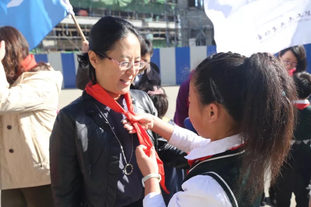 同学们举着自己亲手制作的海报兴高采烈地迎接老师们的到来,并为领导老师们敬献红领巾。