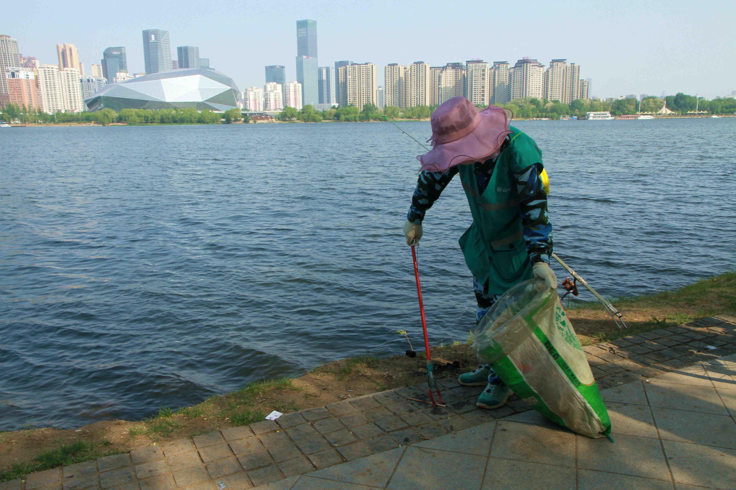 5月17日,沈阳市浑南区奥林皮克公园,女青年环卫工傅师傅在树林和河边埋头捡拾垃圾。人称她:“环保姐”。据了解,她家住沈北新区新华社区,去年5月来这里。她与另一师傅负责从浑河桥到富民桥段的环净卫生。她负责堤内,每天要往返四个来回的捡,最多时一天捡10袋。每天早4时起床,5时20分从家出发,6时20分到现场,下午5时20分下班,6时30分到家,无休息日。她说:“不要写我的名子,这些都是应该做的”。