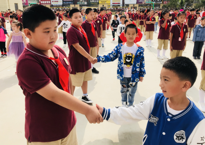 开学典礼中“找到一个好朋友”活动是本学期最受学生欢迎的项目,每个一年级的小同学都会找到一个四年级的好朋友,四年级的学生将会帮助一年级的小同学熟悉校园,了解学校礼仪纪律,告诉他们如何成为一个合格的建大附小学生,以后的大多数活动都会共同参加!以前学生都是跟同班里的同学交朋友,很少打破年级结交新朋友。这次改变原有的交友模式,通过与不同年龄同伴的相互交往、共同生活,学生学习了与人交往的正确态度与技能,克服自我中心,培养良好的社会行为方式,为形成积极健康的个性奠定了良好的基础。