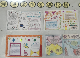 为了增加学生对该活动的参与感,使得感恩这一思想进脑入心,各班同学绘制了主题手抄报,张贴于走廊两侧,增强节日氛围。