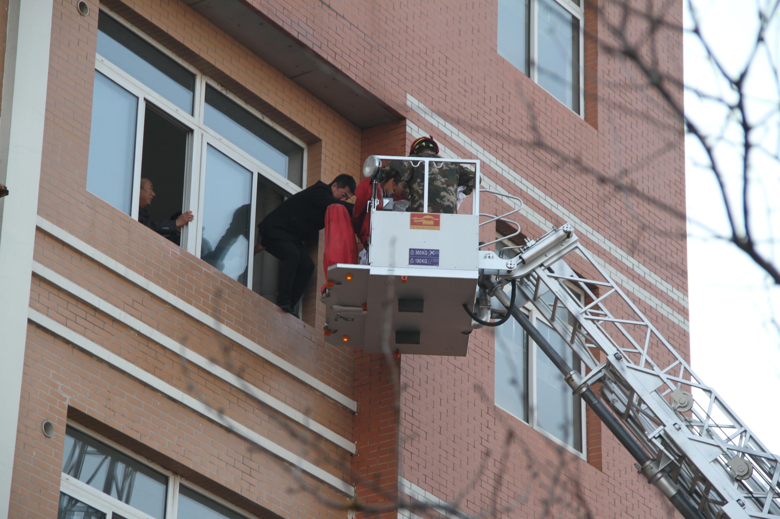 现场还模拟了一名学生被困火场,学校应急领导小组救护组成员立刻实施援救,学校联络员拨打119、120救援电话,消防中队的官兵们驾驶消防车进入校园实施营救。救护组教师用自己的身体护着被困学生,向救援消防车挥舞毛巾示意,救援车辆找到目标,立刻架云梯,成功施救。医疗组立刻对营救下来的师生进行安抚并检查受伤情况。