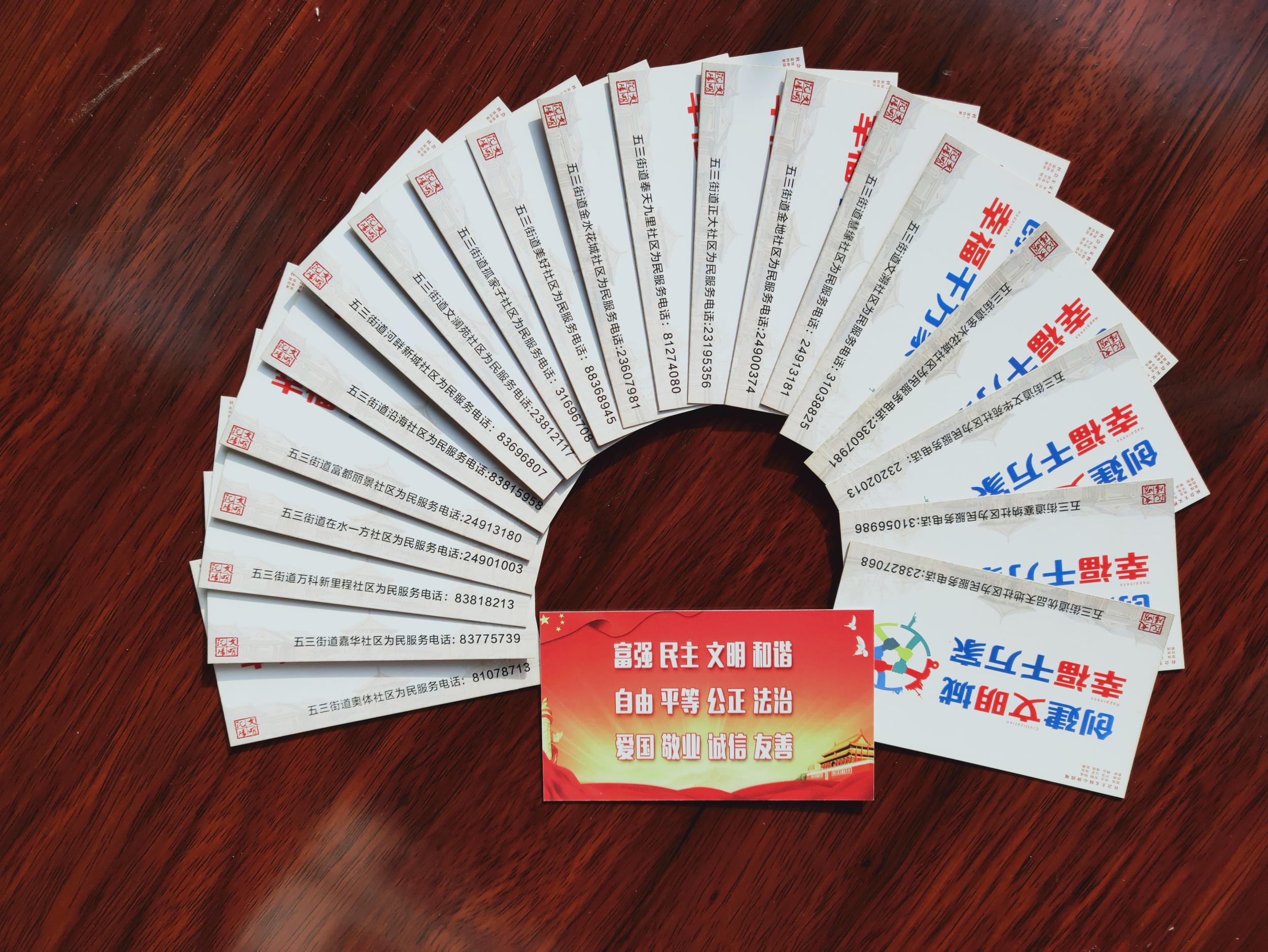 五三街道辖区文明城市创建工作根据市、区两级宣传部领导实地检查督导的意见及建议,建立创建文明城市宣传工作长效机制,为辖区19个社区定做了第二批印有社区便民服务联系电话及社会主义核心价值观的创城宣传卡片1万张,做到“便民服务零距离,创建文明你我同行”,并在辖区120余处沿街超市内醒目位置设置了社会主义核心价值观,确保创城宣传全覆盖。
