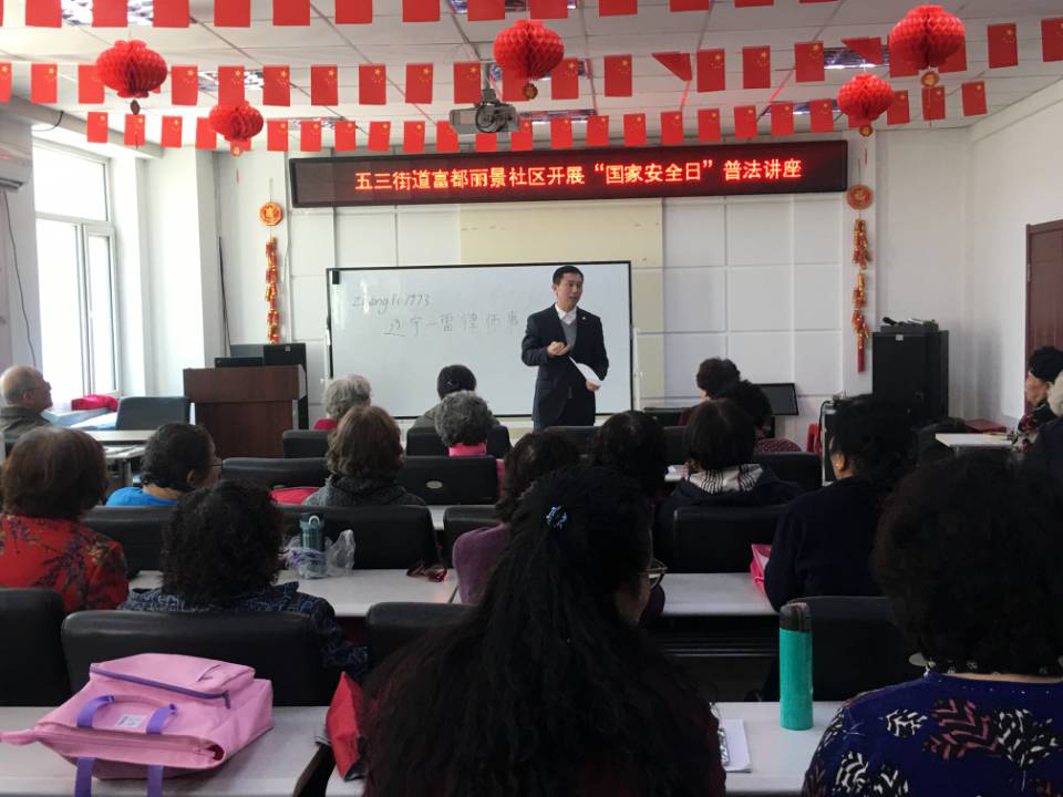 五三街道联合区司法局、一雷等多家律师事务所等掀起了“国家安全日”学法热潮。宣讲活动选取优品天地社区作为主会场,文华苑、富都丽景等多个社区作为分会场,100余名社区群众参加。活动邀