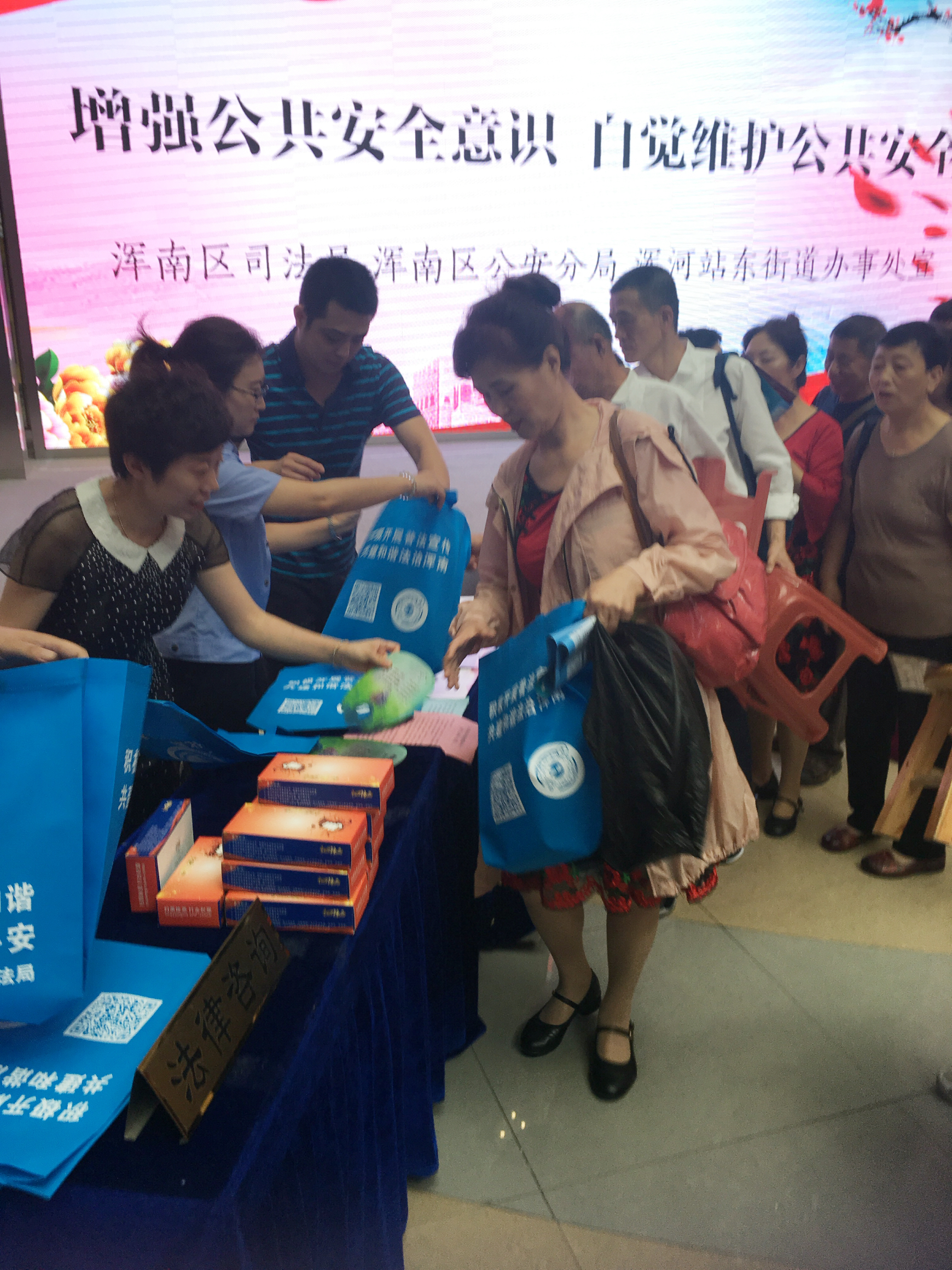 为响应辽宁省司法厅关于开展公共安全法治宣传教育专项活动的指示精神,7月12日上午10时30分,浑南区司法局、浑南区公安分局、浑河站东街道办事处在浑南区红星美凯龙商场负一层举行了以“增强公共安全意识、自觉维护公共安全”为主题的普法宣传活动。