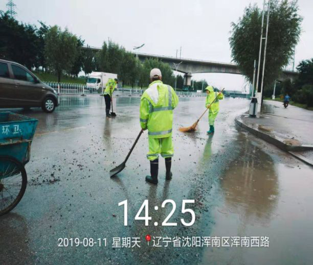 降雨过后,环卫部门及时上路清理路面环境卫生,对街路积水进行打水作业,冲洗路边淤泥,清理路面及雨水口、水篦子垃圾、落叶、树枝,确保浑南道路畅通。