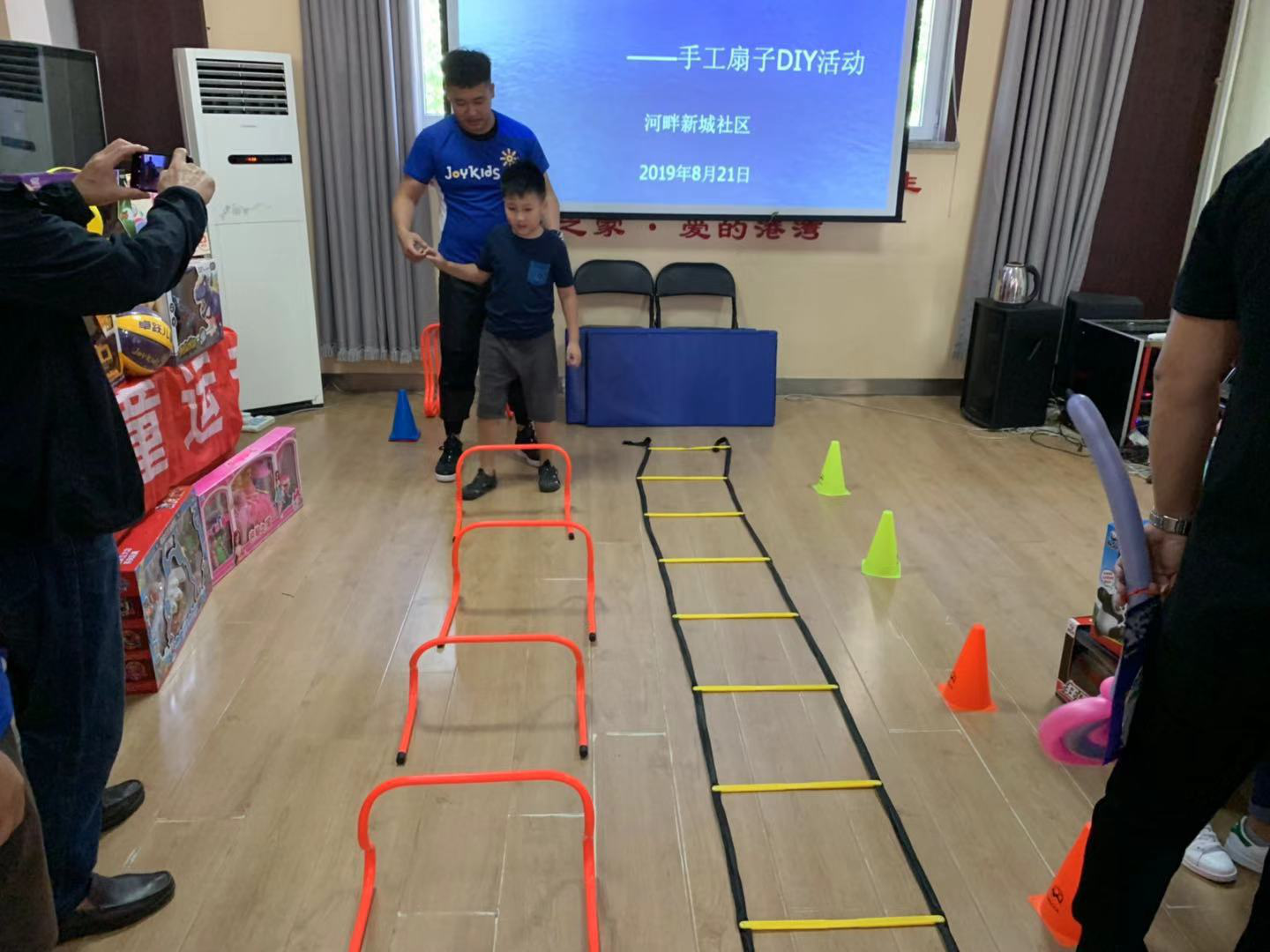 活动共分为手工扇子DIY、体质达标课和少儿英语口语练习三部分。在手工扇子DIY活动中,社区团支部的团员为青少年们精心准备了空白扇面、五彩缤纷的颜料和种类齐全的绘画工具,青少年在团员老师的指导下,拿起画笔,一边画,一边交流心得,互相“传授技巧”。不一会儿,一幅幅美丽的扇子画在青少年的笔下形成了,活动现场充满着浓厚的创作热情和青少年的欢快笑声。在体质达标课程中,针对青少年身体成长的特点,采用“有针对性的运动”的教学方式,以游戏的形式进行训练,让青少年学会正确运用自己身体各部位做有效运动,促进身体发育。在专业老师的教导下,青少年学习了绳梯、跨栏、S跑、仰卧起坐等锻炼动作。在英语口语练习中,以歌舞表演、问题抢答等小环节,调动青少年参与的积极性,激发青少年对英语学习的热爱。