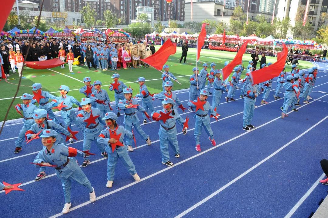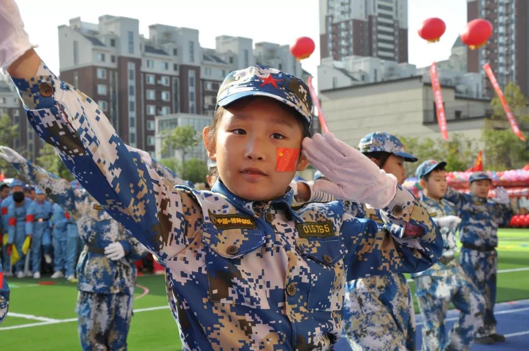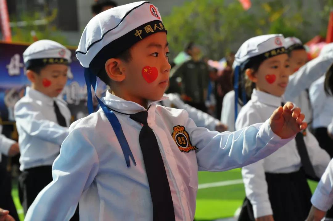 入场式上,孩子们选取了新中国峥嵘岁月中的辉煌瞬间,从抗日战争、解放战争、新中国建立、抗美援朝、两弹一星到改革开放、香港回归、北京奥运,筑梦月球……新中国历史中的一个个高光时刻被孩子们深情演绎。《志愿军进行曲》、《蓝色的海洋》、《石油工人有力量》、《老司机》等歌曲从孩子们口中流淌而出,“我是王成,向我开炮”“绣红旗”那些感人情景被孩子们一次次再现,他们怀着敬仰和追思,带着感悟与希望,将新中国的历史再次连成一部壮美画卷。