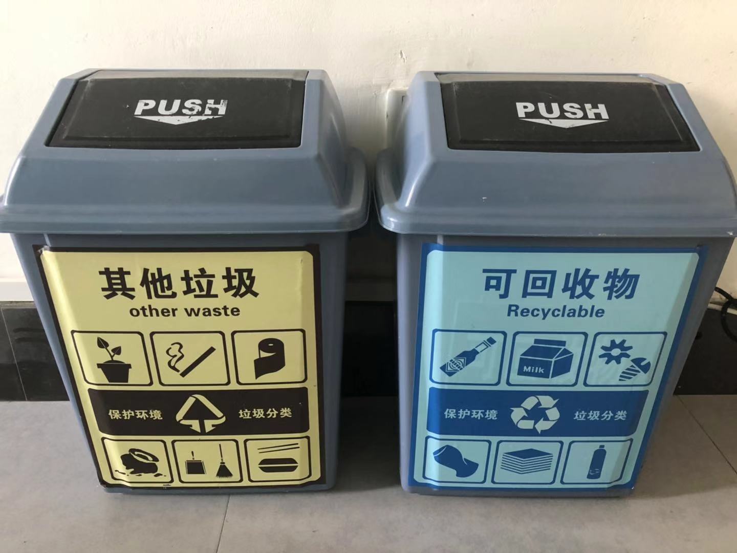 学校统一配置垃圾桶,师生在分类垃圾桶贴上了可回收和其他垃圾标志,在操作的过程中不知不觉地提高了对垃圾分类的认识。