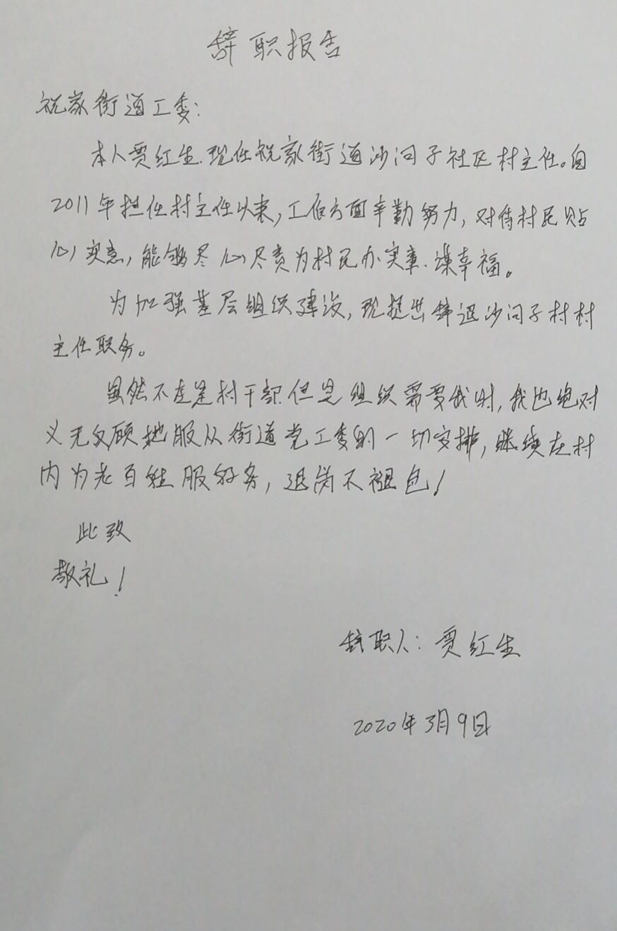 经过分别谈话,有的社区已经开始着手撰写辞职报告,沙河子社区主任贾红生是第一位将辞职报告交到街道党工委的村干部。贾红生自2011年担任村主任以来,工作方面辛勤努力,对待村民贴心实意,一直尽心尽责为村民办实事、谋幸福。每年防火防汛时,他总是时时刻刻冲在最前面,走街串巷、检查危房;处理“非洲猪瘟”时,尽管有“自家养猪不上前”的“老话儿”,但他还是以村民利益为重,冲在前线,帮助农户消杀指导;在抗击疫情时,带头建立村内防线,堵卡站岗、宣传政策、为村民家里进行消杀等。同样,在接到“一肩挑”工作时,他也能够从大局出发,立即行动,提交辞职报告,他表示,“虽然不再是村干部,但是当组织需要我时,我也绝对义无反顾地服从街道党工委的一切安排,继续在村内为老百姓服好务,退岗不褪色!”