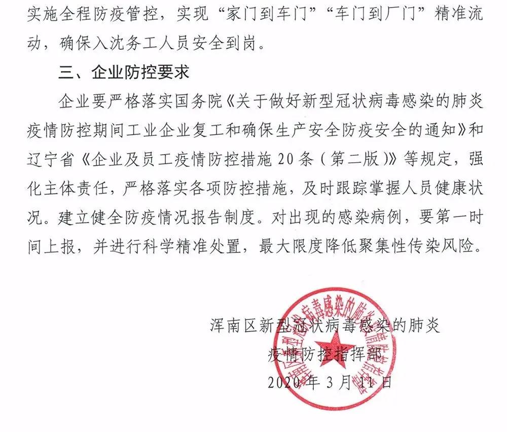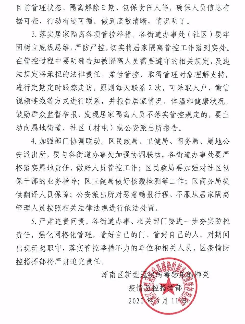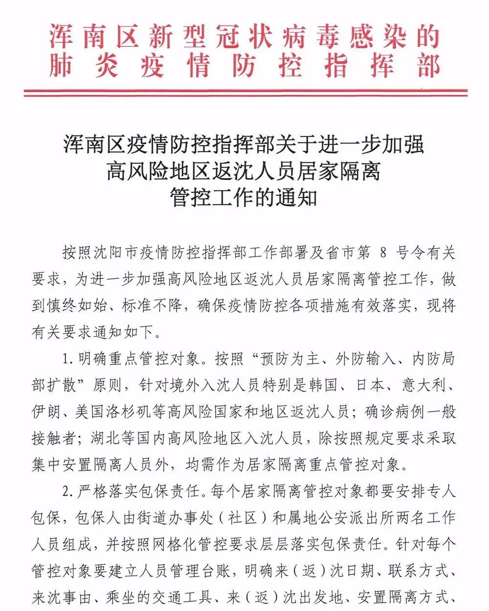 浑南区发布关于进一步加强企业返沈务工人员疫情防控工作的通知