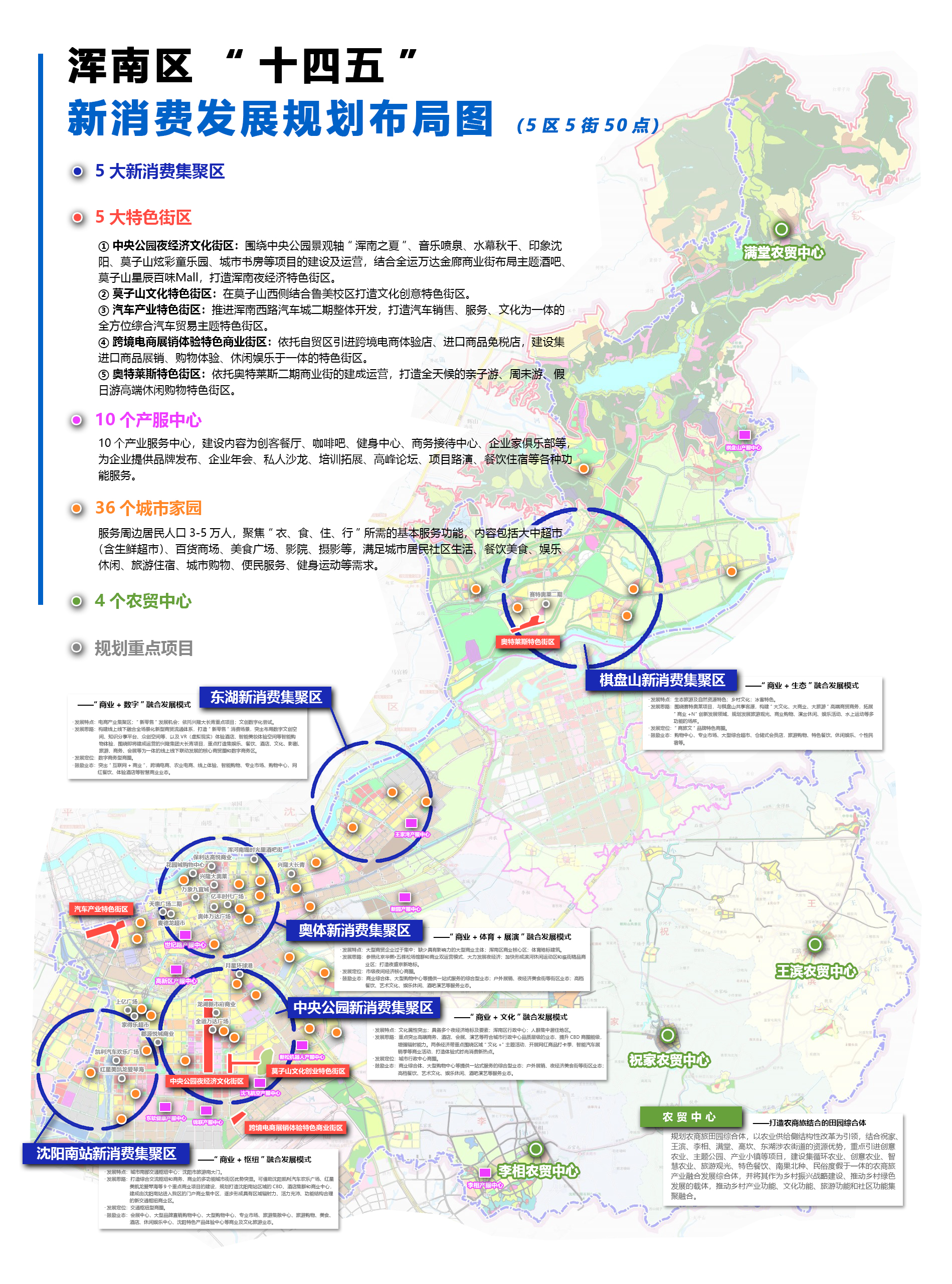 按照“十四五”规划,浑南区将启动商业发展三年行动计划,制定实施重大商业项目投资建设及促进商贸流通业发展鼓励扶持政策,加快推进5大新消费集聚区、5大特色街区、10个产服中心、36个城市家园、4个农贸中心建设,持续升级奥体商圈及夜经济发展,继续组织“浑南中央公园夜市”暨“浑南之夏”文化艺术嘉年华系列活动,聚力打造浑河南堤时光里酒吧街、莫子山文化创业特色街、赛特奥莱休闲文化街及万达金街、龙湖天街、月星环球港等特色街区和重大商业项目,创新运营模式加大布点城市书房、城市家园、城市餐车等“城市”系列民生服务工程,推进形成覆盖全域的“15分钟高品质生活圈”和“5分钟便民服务圈”。