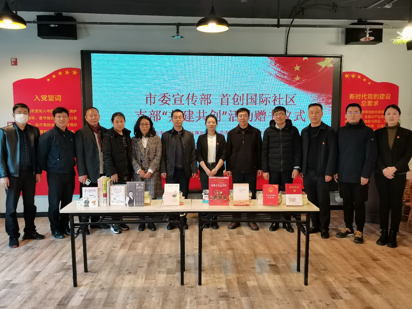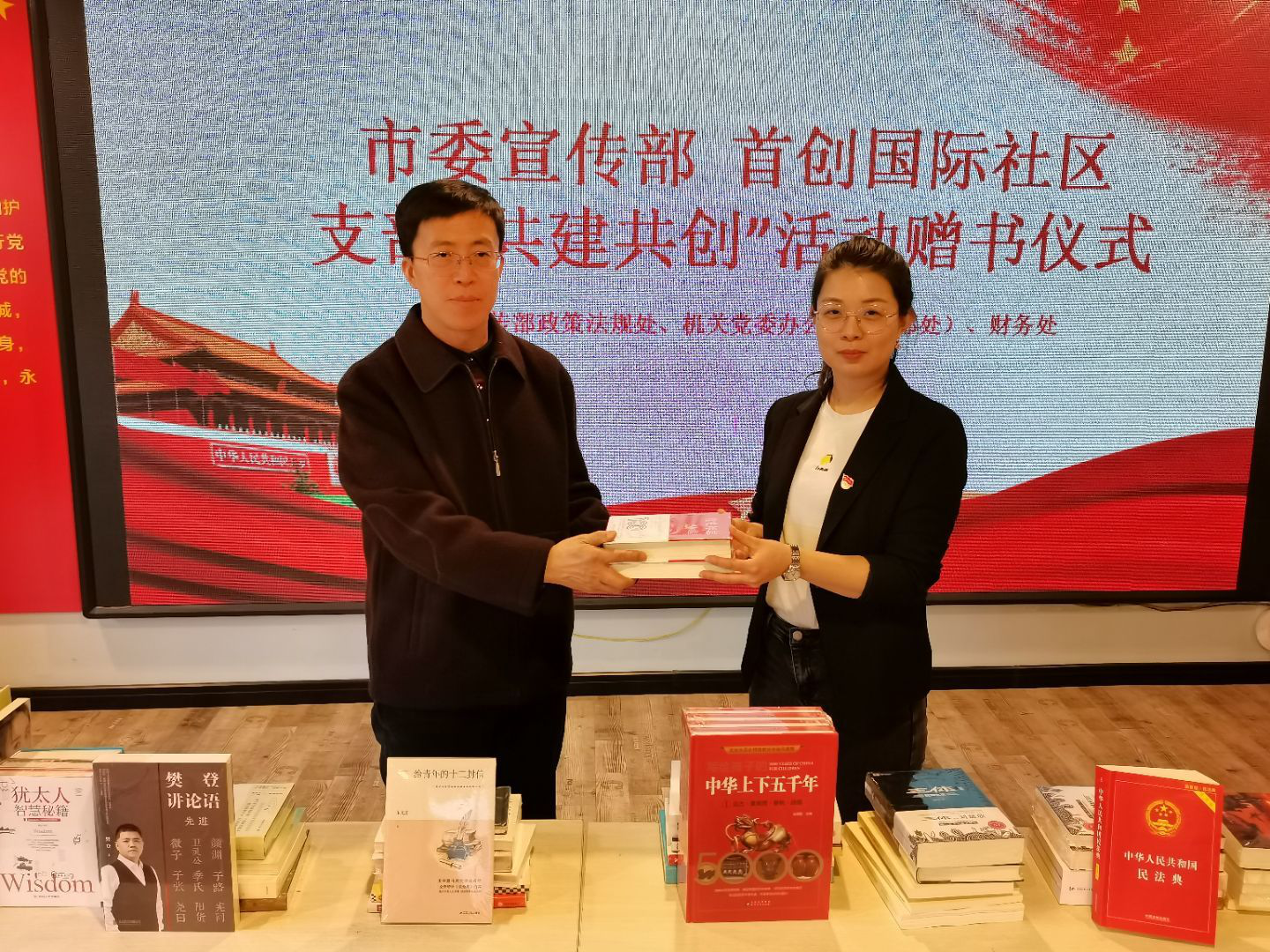 活动现场,市委宣传部机关党委办公室(干部处)李正跃处长首先为本次活动致辞,要深入剖析支部共建共创的深刻内涵,充分落实社区党组织“领头雁”作用,注重开展党群“多元共建,互帮互建、共创共享”活动。财务处徐处长进行了赠书仪式,为首创国际社区书屋充实了党史、亲子教育、畅销书籍共计115册,总价值近5500元的图书资源。